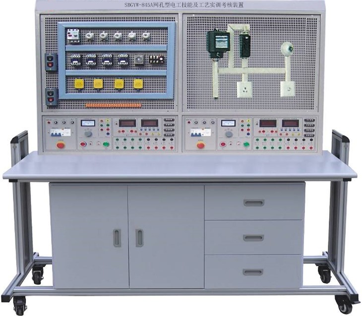网孔型电工技能及工艺实训考核装置主要由实训桌、元件储存柜、网孔板组成。操作者根据实训线路进行元器件的布局、安装、走线,接近工业现场,有利于培养学生的动手能力和操作技能。实训项目可自行确定,根据所选项目选择相应的元器件。其是大中专院校、职业学校、技术及培训机构学生实训和电工考证的理想考核设备。